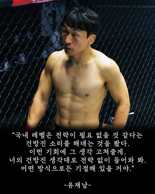유재남은 “국내 레벨은 전략이 필요 없을 것 같다는 건방진 소리를 해대는 것을 봤다. 무지함에서 나온 소리라고 생각한다. 이번 기회에 그 생각을 고쳐주겠다. 너의 건방진 생각대로 전략 없이 들어와 봐라. 어떤 방식으로든 너는 기절해 있을 것”이라고 말했다.