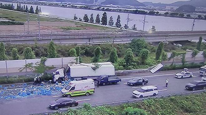 이 사고로 화물차에 적재된 소주 수백 병이 도로에 쏟아지면서 4개 차로 중 2개 차로가 통제됐습니다.