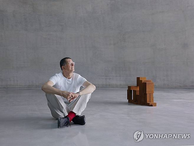 (서울=연합뉴스) 영국 출신 현대 조각 거장 안토니 곰리(Antony Gormley)가 19일 자신의 개인전 '드로잉 온 스페이스(DRAWING ON SPACE)'가 열린 강원도 원주시 뮤지엄 산에서 작품과 함께 기념촬영하고 있다.