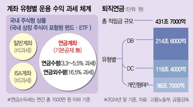 19일 금융투자 업계에 따르면 현재 확정급여형(DB)·확정기여형(DC)·개인형퇴직연금(IRP) 등 연금 계좌에서 국내 상장 주식이 포함된 펀드나 상장주식펀드(ETF) 등 금융상품에 투자해 매매차익이 발생하면 연금 수령 시점에 따라 세금이 부과된다. 연간 총 1500만 원 이하로 연금을 수령하는 경우 저율의 연금소득세(3.3~5.5%)를, 일시에 찾으면 기타소득세(16.5%)가 적용된다. 연금소득이 연 1500만 원을 넘을 때는 다른 소득과 합산과세해 단일세율(16.5%)을 매긴다.