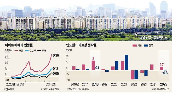 토지거래허가구역 확대 지정, 스트레스 총부채원리금상환비율(DSR) 규제 등의 ‘약발’이 듣지 않으면서 서울 아파트값이 크게 오른 2018년과 비슷한 양상이 나타나는 것 아니냐는 우려가 나온다. 당시 서울 아파트 매매가는 1년간 8.0% 상승해 2006년(23.5%) 이후 가장 많이 뛰었다. 올 들어서도 전국이 0.3% 내리는 동안 서울은 2.7% 올랐다.