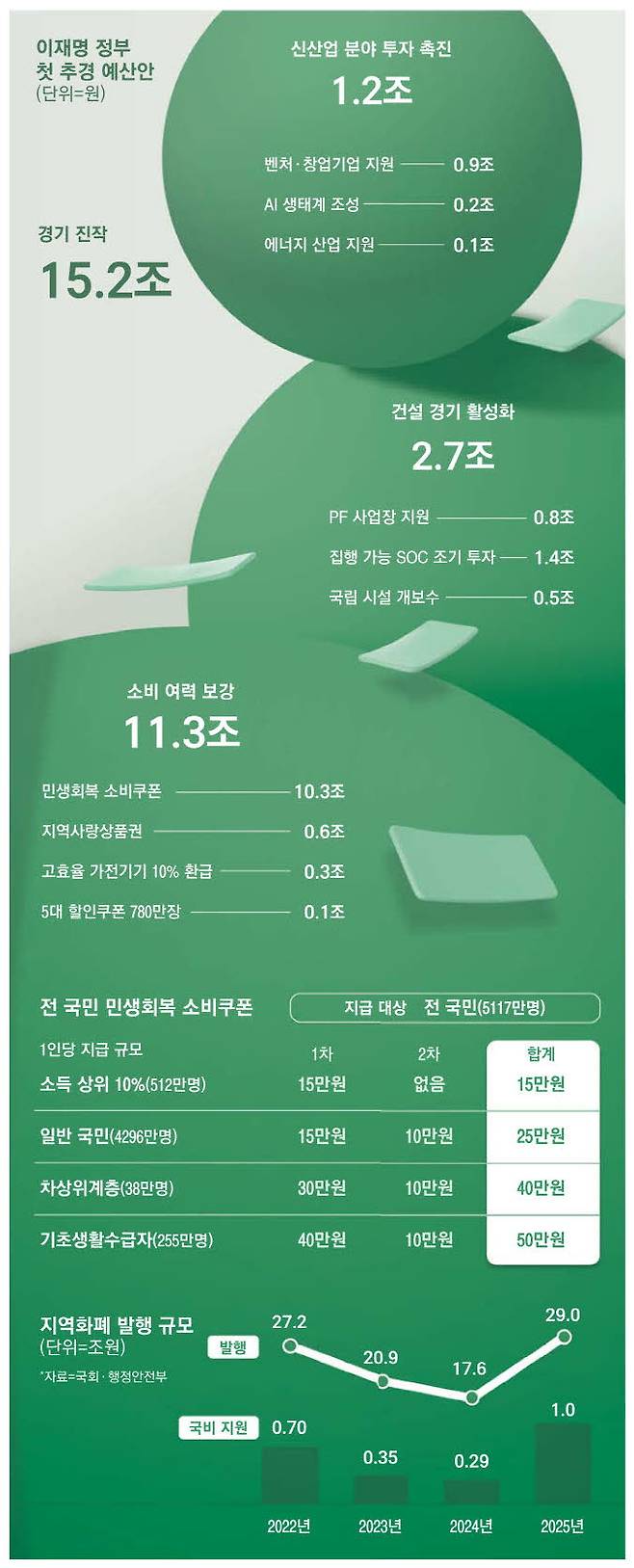 이재명 대통령의 역점 사업인 지역화폐 발행 지원 예산도 6000억원 담겼다. 올해 1차 추경에서는 4000억원이 반영됐다. 이에 따라 전국 지방자치단체에서 발행하는 지역화폐 총량은 29조원에 달할 전망이다. 문재인 정부 때인 2022년에 기록한 27조2000억원을 넘어 사상 최대 규모다.
