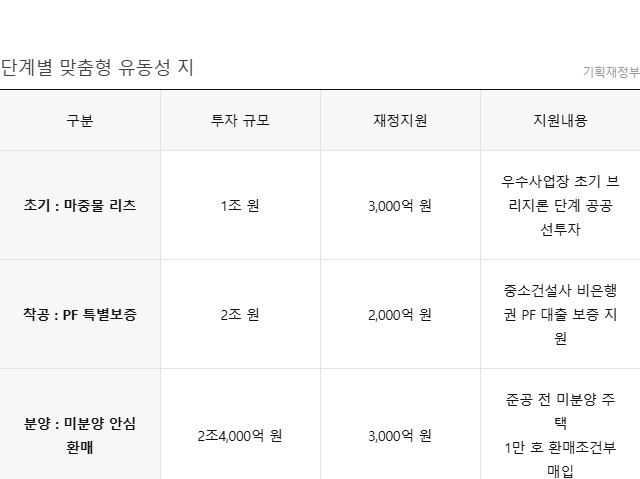 우선 우수사업장 정부 출자 마중물 리츠에 3,000억 원, 주택도시보증공사(HUG)를 통한 중소건설사 PF 특별보증에 2,000억 원을 배정했다.