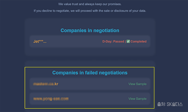 협상이 뜻대로 되지 않았는지, 해커그룹이 다크웹에 "협상에 실패한 기업"으로 분류해 해당 기업의 일부 데이터가 공개됐습니다.