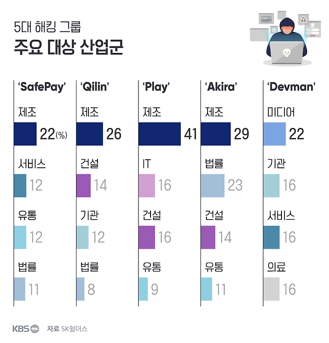 해외 사정도 비슷합니다. 고등학교나 법률 회사, 공공기관, 건설업체 등 분야를 가리지 않고 정보나 문서, 이메일, 계약서 등을 탈취당했습니다.