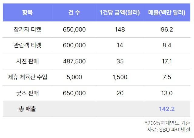 참가자(선수) 티켓 매출만 약 9620만 달러(1324억원)에 이른다.