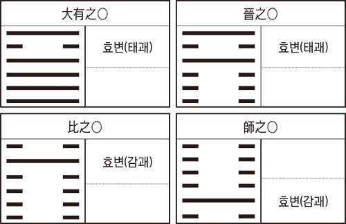 즉, 육변서해 주효가 이괘(離卦)가 돼 있는 괘(화천대유, 화지진 등)를 득괘 했을 경우, 그 변효괘가 태괘였다면 고등(高騰)의 대세이나 일단은 내린다고 본다. 또한 주효가 감수(坎水)가 돼 있는 괘(수지비, 지수사 등)를 득괘 했을 경우, 변효괘가 감괘였다면 밑바닥까지 하락한다고 본다.