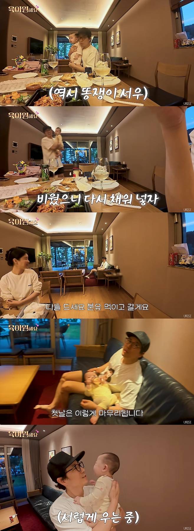 그렇게 "삐뽀삐뽀"라며 급하게 화장실로 이동한 장수원은 이내 "서우 왔어요"라며 자리로 돌아왔고, 서우가 울기 시작하자 소파로 이동해 분유를 먹였다.