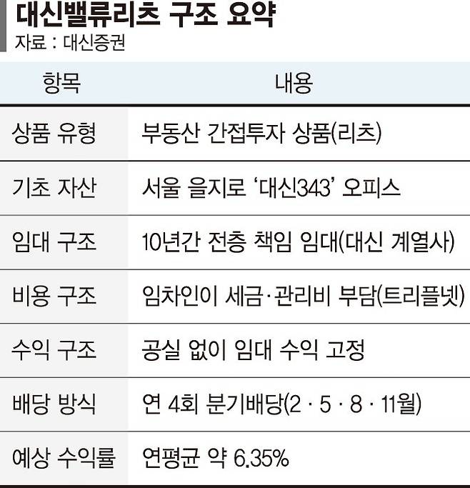 박영곤 대신자산신탁 리츠투자부문장은 "대신밸류리츠는 서울 중심업무지구 내 프라임급 자산을 기반으로 안정적인 임대수익과 분기배당 구조를 갖추고 있다"며 "금리 인하 흐름 속에서 개인 투자자에게도 충분히 매력적인 대안이 될 것"이라고 덧붙였다.