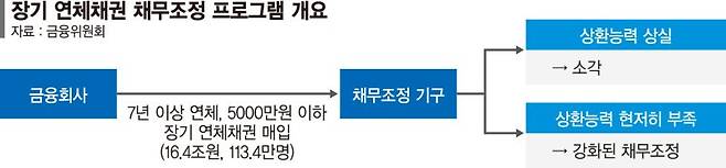 먼저 정부는 7년 이상 연체된 5000만원 이하의 개인(개인사업자) 무담보채권을 일괄 매입해 소각 또는 채무조정하기로 했다. '중위소득 60% 이하'로 처분 가능한 재산이 없는 경우엔 장기연체채권을 전액 소각한다. 빚을 100% 탕감한다는 뜻이다. 송병관 금융위 서민금융과장은 "파산에 준하는 수준으로 상환능력을 상실한 연체자만 엄격하게 선별해 지원할 것"이라고 설명했다.