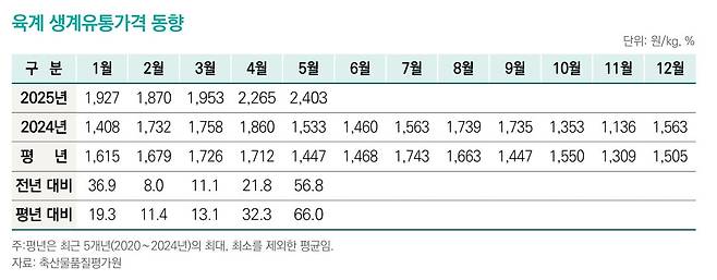 가장 비싼 넓적다리살(허벅지·정육)은 kg당 1만5000원선이다. 작년에는 1만2000원 정도였고, 5년 전과 비교하면 50% 이상 오른 상황이다.