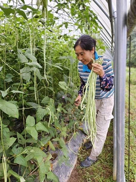 | ▲ 1주일에 두번씩 수확하는데 날씨만 더우면 60cm 이상 길게 자란다. 아내가 줄콩을 수확하고 있다. |