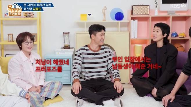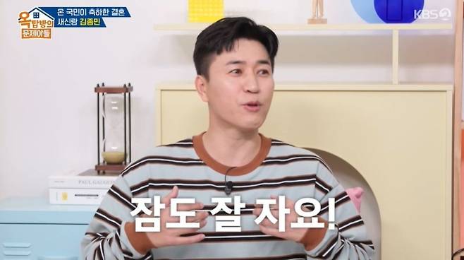 송은이가 "어른들 말로 신수가 훤해졌다"라고 칭찬하자 김종민은 "관리를 하고 있다. 2세 준비도 해야 하니까"라고 밝혔다. 홍진경은 "결혼 잘한 것 같냐. 좋냐"라고 물었고, 김종민은 "너무 좋다"라며 "아침에 안을 수 있어서 좋다. 안정감이 있다"라고 밝혔다. 김종국이 "혼자 자다가 같이 자면 불편하지 않냐"라고 의아해하자 김종민은 "아니다. 내가 잠도 잘 잔다"라고 했다.