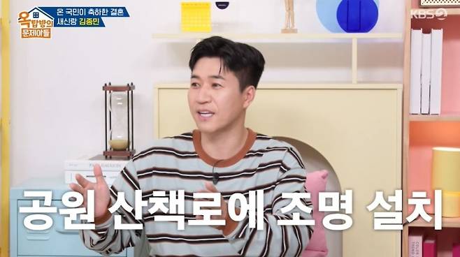 김종민은 프러포즈에 대해 "레스토랑 룸을 빌렸다"라고 하다 "공원 산책로에 조명을 설치했다. 이벤트 회사 하는 처남이 도와줬다"라며 아내가 감동의 눈물을 흘렸다고 밝혔다. 이에 MC들은 "업자를 끼고 한 거냐. 프러포즈를 처남이 해주고 돈만 낸 거네"라고 공격했다.