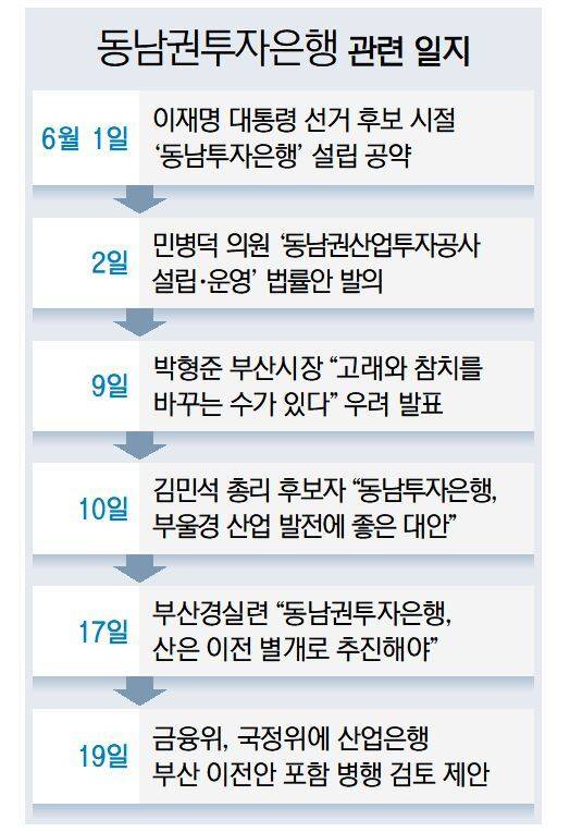 금융위의 이 대통령의 동남권투자은행 공약 관련한 국정기획위 업무보고서 내용(부산일보 6월 19일 자 1면 보도)이 알려지면서 지역에서는 우려와 기대가 교차하고 있다. 금융위는 공약 세부 이행 계획으로 △동남권투자공사 신설 △산은 부산 이전 논의 △산은 등 정책금융기관 체계 개편 등을 ‘병행 검토’해야 한다는 제안을 담은 것으로 알려졌다.
