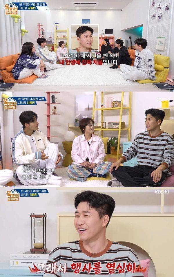 19일 방송된 KBS2 예능프로그램 '옥탑방의 문제아들'에서는 신혼 2개월 차에 접어든 코요태 김종민이 출연했다.