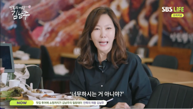 열심히 먹방을 하던 김남주는 “너튜브 하길 잘했어. 지난 31년 동안 여배우로 살면서 촬영 때문에 못 먹었다. 근데 촬영하면서 이렇게 먹으니까 어색하네?”라고 밝혔다. 김남주는 “나이스”라며 미소를 지었다.