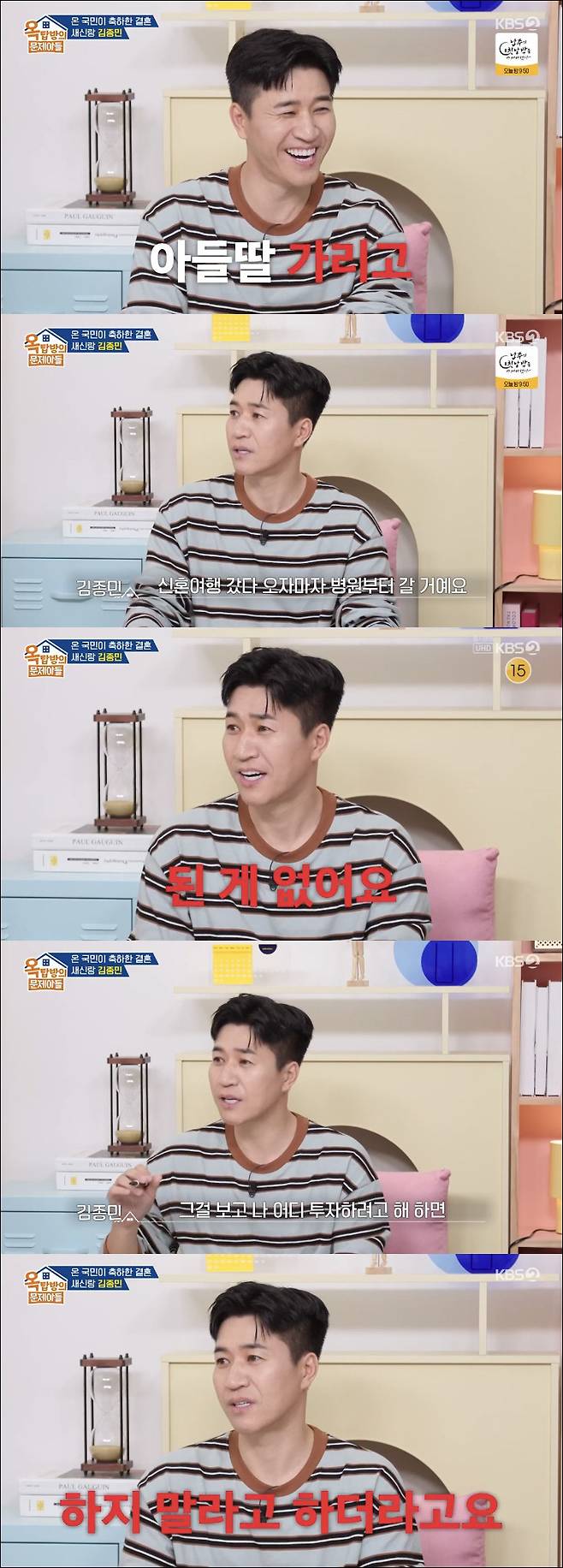 김종민은 결혼을 결심한 계기에 대해 "만나면서 확신을 가진 게 저랑 다투면 잘 삐치는 스타일인데 말로 표현이 안 돼서 말을 안 하게 된다. 그러면 그걸 풀어준다"고 밝혔다. 김종민은 "얼마 전에 삐친 게 90년대 노래를 듣는데 왜 옛날 노래를 듣냐더라. 거기에 삐쳤다"고 밝혔다. 이에 멤버들은 "그거에 왜 삐치냐", "너무 사소하다"며 웃음을 터뜨렸다. 김종민은 "근데 아내가 바로 알아채고 앞으로는 바로 바로 얘기하라더라"라고 아내를 향한 애정을 드러냈다.