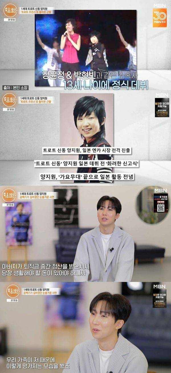 앞서 양지원은 13살 트로트 신동으로 이름을 알리고 제2의 보아를 꿈꾸며 일본 시장에 진출했다고. 하지만 이날 그는 "일본 바로 가면 스타 되는 줄 알고 행복한 꿈을 꾸며 일본으로 갔다. 그때부터 고통과 인내의 시간이었다"고 털어놨다.