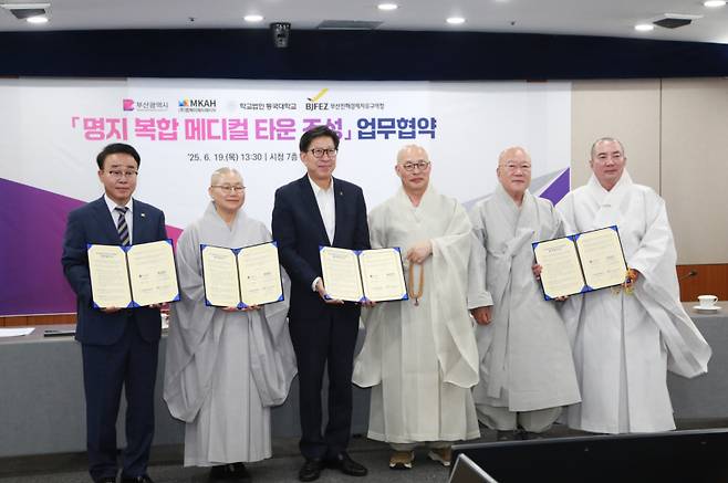 부산진해경제자유구역청(청장 박성호)은 19일 부산시청에서 부산시, 동국대학교, 엠케이에이에이치와 함께 '복합 메디컬 타운 조성을 위한 양해각서(MOU)'를 체결했다.