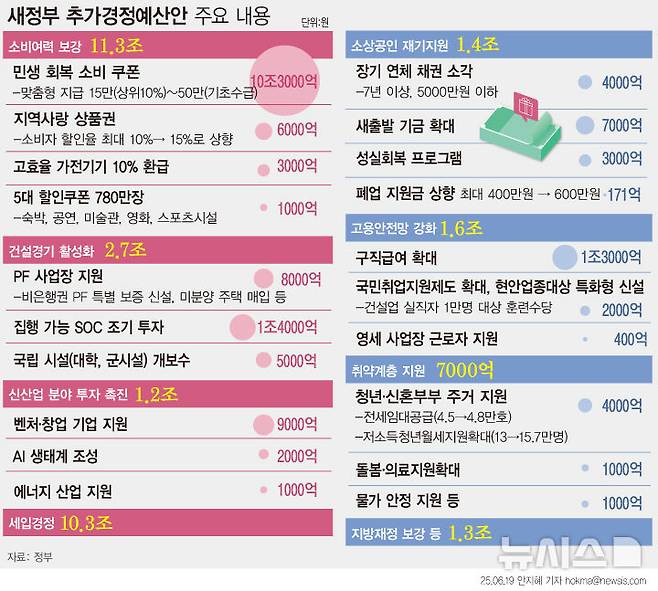 [서울=뉴시스] 정부가 30조5000억원 규모의 추경안을 편성했다. 전 국민 1인 당 15만~52만원의 민생회복 소비쿠폰지급에는 총 13조2000억원이 투입된다. 또한 내수경제 활성화 및 전력 소비 저감 유도를 위해 고효율 가전제품 구매비용의 10%(30만원 한도)를 환급하는 사업에 3261억원을 신규로 배정했다. 구직급여 지원 대상도 약 19만명 확대한다. 지역 건설경기 활성화를 위해 철도, 항만 등 SOC에 1조4000억원을 투자하고 조기 착공에 나서기로 했다. (그래픽=안지혜 기자)
