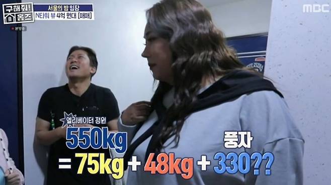 풍자는 "그럼 내가 330㎏인 거냐?"며 당혹스러워했다. 박나래는 "지식인에 '풍자 씨 300㎏이냐'는 글이 있다. 근데 우리가 이걸 실제로 확인한 거냐"며 놀라워하자, 풍자는 자포자기한 듯 "360㎏ 설도 있다"고 셀프 디스해 폭소케 했다.