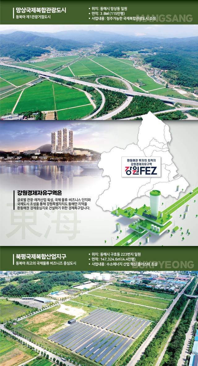 망상동 일원 3.8㎢(115만평)는 강원경제자유구역 중 규모가 가장 크다. 망상 1지구는 글로벌 스마트 복합도시, 망상 2·3지구는 글로벌 리조트로 건설된다.