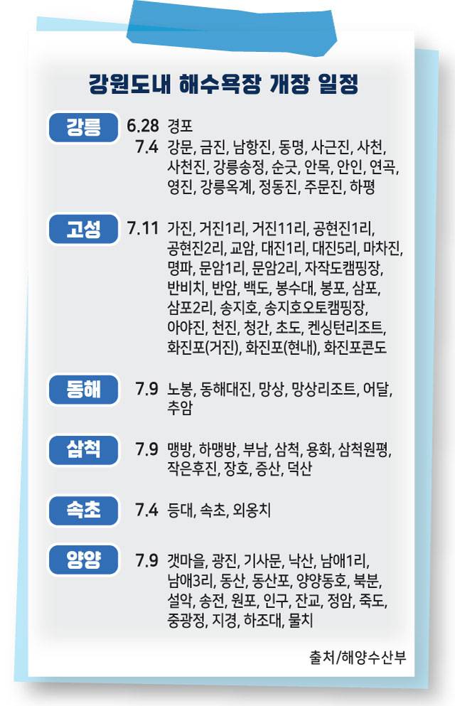올해는 강릉 경포해수욕장이 오는 28일 가장 빨리 문을 열며 여름 휴가철 서막을 알린다. 이어 7월 4일에는 강릉의 나머지 17개 해수욕장과 속초지역 3곳이 동시에 개장한다. 동해와 삼척지역 해수욕장은 7월 9일, 양양과 고성지역은 7월 11일 차례로 개장한다. 대부분의 해수욕장은 8월 24일까지 운영된다.