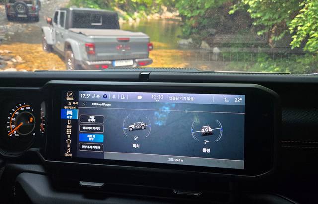 바닥이 울퉁불퉁해 말을 타고 있는 것처럼 차량이 흔들렸다. 루비콘엔 차량의 기울기를 나타내는 피치와 롤링을 보여주는 기능이 있는데 디스플레이에서 이 숫자가 요동쳤다. 암석 때문에 바퀴가 흔들리면서 운전대(스티어링 휠)가 마음대로 움직였다.