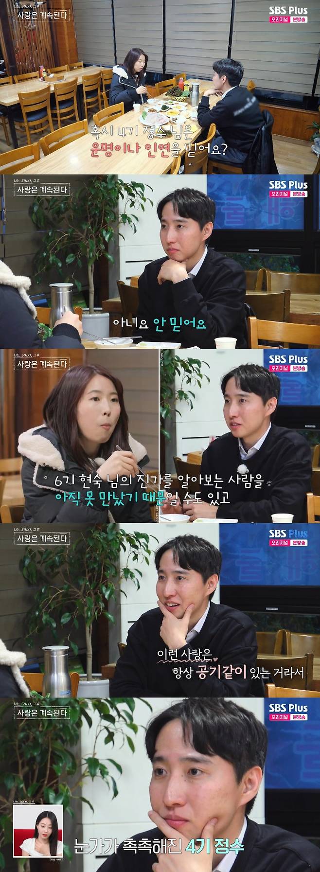 데이트 도중 6기 현숙은 "혹시 운명이나 인연을 묻냐"고 물었고, 4기 정수는 "안 믿는다"면서 "인연이 없을 수도 있다. 현숙 님의 진가를 알아보는 사람을 아직 못 만났기 때문일 수도 있고, 그런 사람이 있었지만 현숙님이 기분을 사랑하지 않았을 수도 있지 않냐"고 답했다.