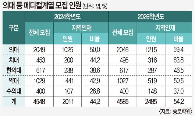 19일 종로학원이 전국 의대·치대·한의대·약대·수의대 등 메디컬 계열의 지역인재전형을 분석한 결과 2024학년도 2011명에서 2026학년도 2485명으로 23.6% 증가한 것으로 집계됐다.