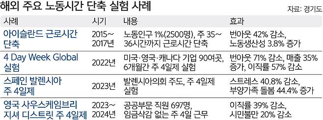 도는 시범사업을 올해부터 2027년까지 한시적으로 펼쳐 노동생산성, 직무만족도 등 44개 세부지표를 분석할 예정이다. 분석 결과를 토대로 적정 노동시간에 대한 합의를 도출하고 정부에 개선을 건의할 방침이다.