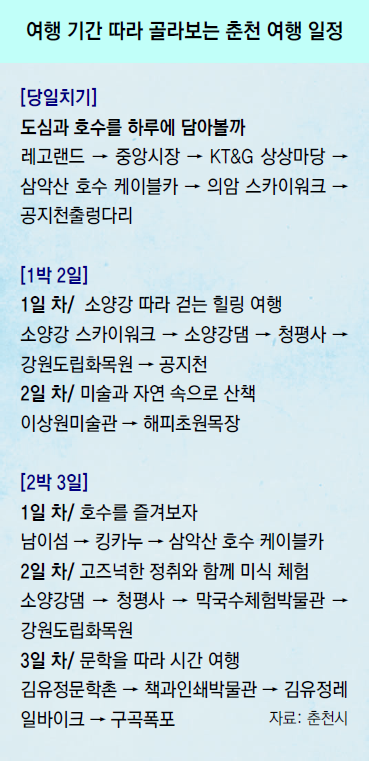 춘천 중도에는 글로벌 테마파크 ‘레고랜드 코리아리조트’가 있다. 세계에서 10번째로 개장한 레고랜드로 만 2세에서 12세의 자녀를 둔 가족들이 즐길 수 있는 놀이기구와 어트랙션으로 구성돼 있다. 이 밖에 경춘선 김유정역에서 출발하는 김유정레일바이크, 삼악산 호수 케이블카, 물레길 킹카누도 자녀들과 함께할 수 있는 만점 즐길 거리다.