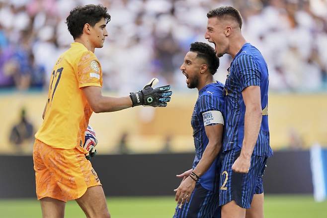 | 막았다! 알힐랄(사우디아라비아) 골키퍼 야신 부누(왼쪽)가 19일 열린 레알 마드리드(스페인)와의 2025 FIFA 클럽월드컵 조별리그 H조 1차전에서 후반 42분 페데리코 발베르데(우루과이)의 페널티킥을 막아낸 뒤 환호하고 있다. 1-1 무승부를 기록한 알힐랄은 승점 1을 따냈다. 마이애미=AP 뉴시스 |