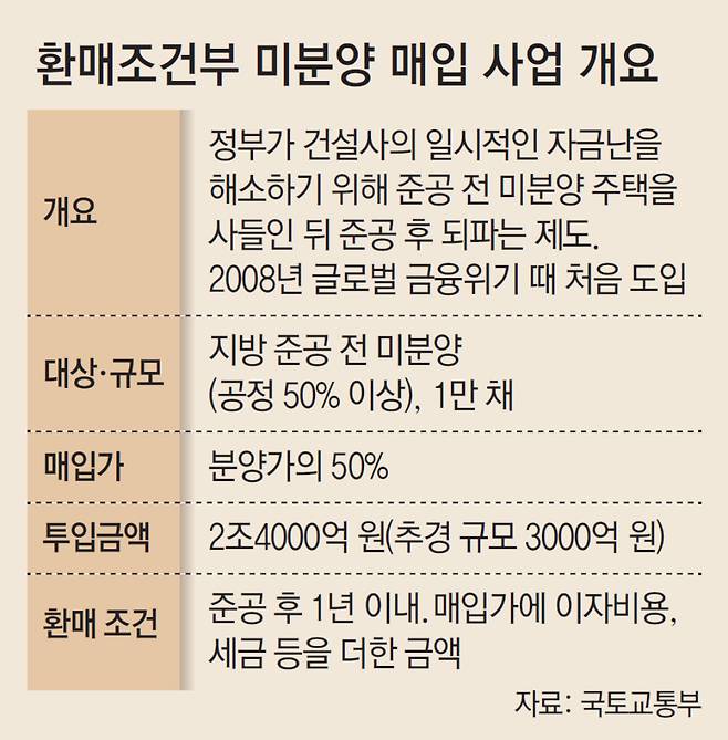지방 분양 경기 침체로 자금난을 겪고 있는 건설사들에 유동성을 공급하기 위해 2008년 글로벌 금융위기 이후 17년 만에 '환매 조건부 매입' 카드를 꺼낸 것이다.