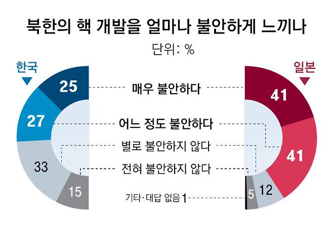 한편 한국에서만 조사를 진행한 ‘북-중-러가 밀착하는 가운데 한일 간 안보 협력은 어떻게 진행돼야 하나’란 질문에도 ‘강화하는 것이 좋다’가 58%였다. 이어 ‘현재 수준이 좋다’(30%), ‘약하게 하는 것이 좋다’(9%), ‘기타·대답 없음’(3%) 순이었다. 지난해 북한은 우크라이나 전쟁에서 러시아를 돕기 위해 1만1000명 규모의 군대를 파병하는 등 북-러가 군사적 혈맹 관계에 접어든 상황이다. 또 미중 경쟁이 가속화되는 가운데 중국은 2023년 이후 매해 핵탄두를 100개씩 늘리고 있다. 이런 상황에서 양국 간 안보 협력을 강화해야 한다는 인식이 한국에서 또 한번 뚜렷해진 것을 엿볼 수 있었다.
