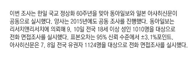 한일 국교 정상화 60주년을 맞아 동아일보와 일본 아사히신문이 실시한 공동 여론조사에서 양국 국민은 서로 안보 협력을 강화하는 게 필요하다는 데 공감했다.