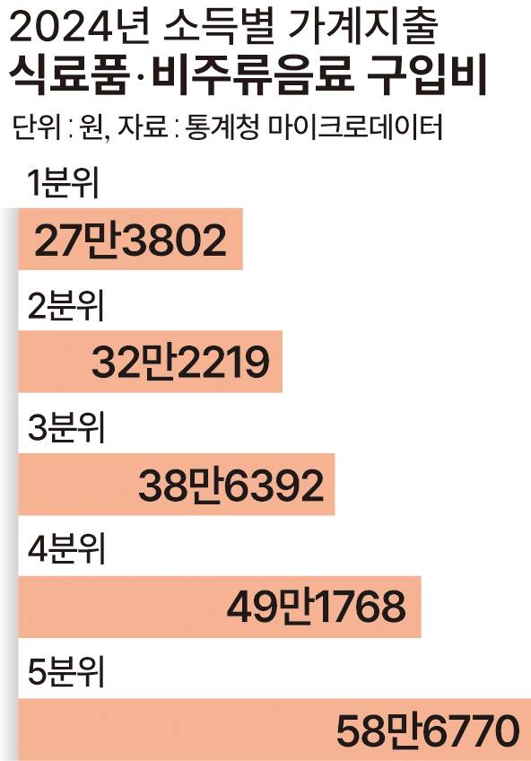 이같은 식량 공급 위기의 충격파는 차별적으로 나타났다. 저소득층 등 취약계층이 더 큰 영향을 받는다. 소득이 낮을수록 식품 소비 지출액이 적어 식생활이 부실할 공산이 크다. 통계청 가계동향조사 마이크로데이터를 분석한 결과 2024년 소득 1분위(하위 20%)의 평균 식료품·비주류음료 구입비는 27만3802원인 반면 5분위(상위 20%)는 58만6770원으로 나타났다. 육류와 과일·채소 가공품 등의 지출 차이는 더욱 컸다.