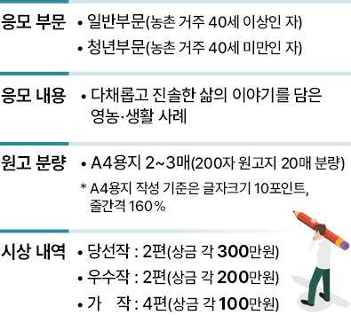 올해는 일반부문(40세 이상)과 청년부문(40세 미만)으로 작품을 모집한다. 분량은 A4용지 2~3매(200자 원고지로 환산하면 20매)며 주제는 ‘다채롭고 진솔한 삶의 이야기를 담은 영농·생활 사례’다. 예를 들어 ▲실패나 역경을 딛고 이겨낸 일화 ▲귀농·귀촌의 소소한 즐거움 ▲자신과 공동체의 성취 등을 솔직하게 쓰면 된다.