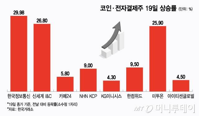 이 밖에도 신세계 I&C(26.8%), 카페24(5.8%), NHN KCP(9%), KG이니시스(4.3%) 등 주요 전자결제 관련 기업들의 주가가 큰 폭으로 올랐다. 블록체인 기반 암호화 솔루션 기업인 한컴위드도 9% 이상 상승했다.