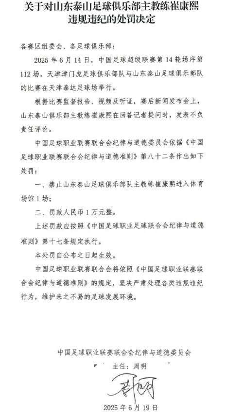 [SPORTALKOREA] 박윤서 기자= 산둥 타이산 최강희 감독이 징계를 받았다.