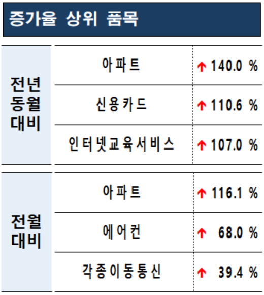 전월 대비 소비자상담 증가율 역시 ‘아파트’ 항목 증가율이 가장 높았습니다. 361건을 기록해 전월보다 116.1% 증가했고, '에어컨'이 153건으로 68% 늘었습니다. '에어컨'은 냉방 기능이 불량이거나 설치 하자에 대해 과도한 수리비를 요구한다는 상담이 많았습니다.