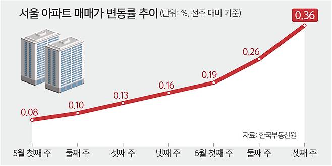 한국부동산원이 19일 발표한 '6월 셋째 주(16일 기준) 주간 아파트 가격 동향'에 따르면 이번주 서울 아파트 매매가격은 전주 대비 0.36% 오르며 20주 연속 상승세를 이어갔다.
