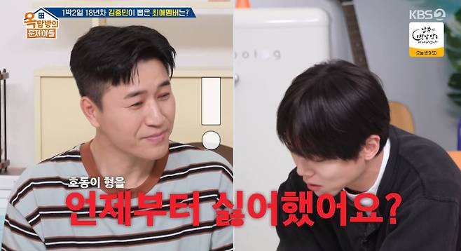 김종민이 "호동이형이요?"라며 당황해하자 주우재는 "호동이 형을 몇 회차부터 싫어했냐"고 짓궂게 질문했고, 김종민은 "호동이 형이 왜 안 들어갔지?"라며 능청스럽게 모르쇠로 일관해 현장을 폭소케 했다.
