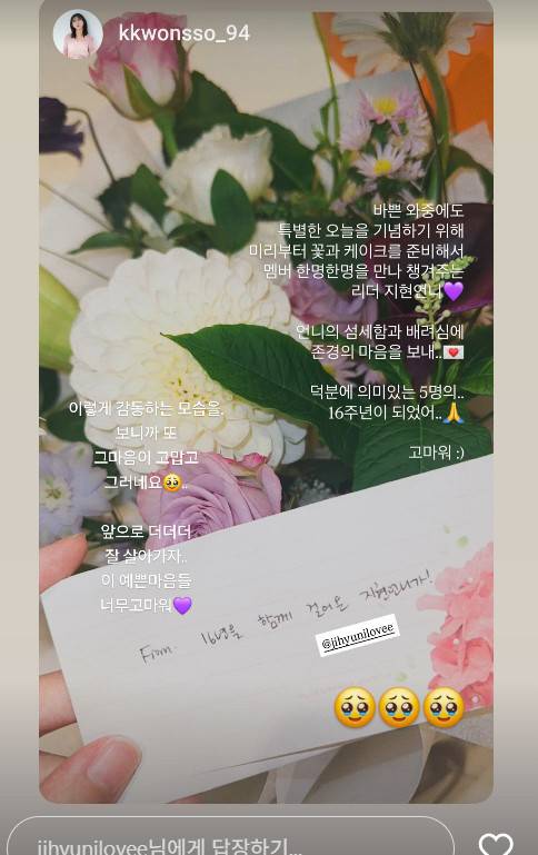 권소현은 "바쁜 와중에도 특별한 오늘을 기념하기 위해 미리부터 꽃과 케이크를 준비해서 멤버 한 명 한 명을 만나 챙겨주는 리더 지현 언니. 언니의 섬세함과 배려심에 존경의 마음을 보내"라며 "덕분에 의미 있는 5명의 16주년이 되었어 고마워"라며 감사를 표했다.