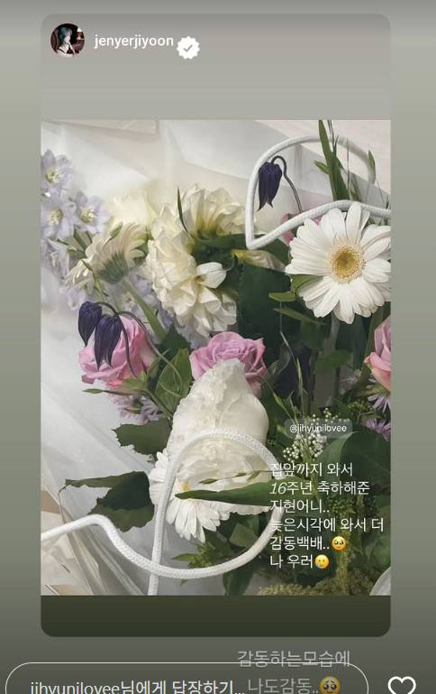 이에 전지윤은 전날 "집 앞까지 와서 16주년 축하해 준"이라며 "늦은 시간에 와서 더 감동 백배... 나 울어"라며 인증숏을 올렸다. 남지현은 "감동하는 모습에 나도 감동"이라고 답했다.