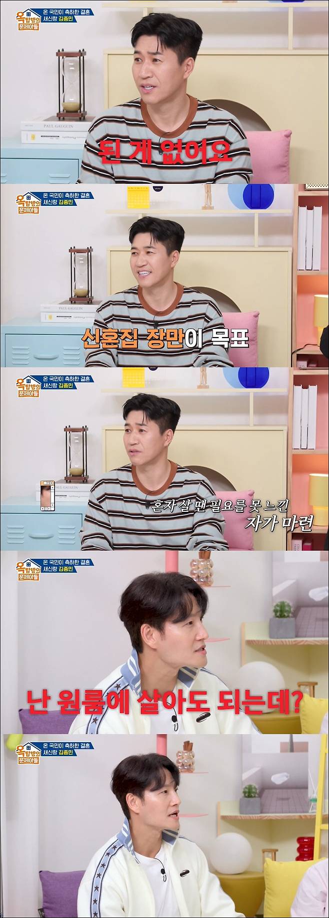 결혼 후에는 수익을 서로 공개하고 투자도 상의를 한다고. 김종민 부부의 현재 목표는 신혼집 장만이었다. 이에 김숙은 "30년 가까이 했는데 집을 한번도 안 샀냐"고 놀랐고 김종민은 "관심이 없었다"고 밝혔다. 이에 공감한 김종국은 "나도 그랬다. 집에 관심이 없었다. 원룸에 살아도 된다 싶었다"며 "난 재테크를 아예 안 했다. 저금만 했다. 아는 게 없어서 투자해서 돈을 버는 게 안 된다"고 밝혔다.