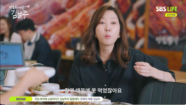 열심히 먹방을 하던 김남주는 "너튜브 하길 잘했어. 지난 31년 동안 여배우로 살면서 촬영 때문에 못 먹었다. 근데 촬영하면서 이렇게 먹으니까 어색하네?"라고 밝혔다.