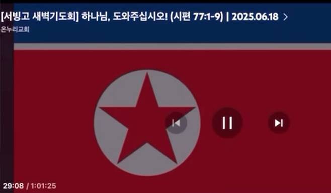 19일 온누리교회에 따르면 전날 새벽 서울 용산구에 있는 이 교회 서빙고 캠퍼스(서빙고 온누리교회)에서 박 모 목사의 설교 장면을 유튜브로 중계하던 중 약 20초 동안 화면에 인공기가 등장했습니다.