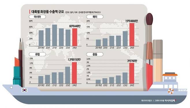 우리나라 전체 화장품 수출에서 유럽과 중동 지역이 차지하는 비중도 커졌다. 관세청 한국무역통계에 따르면 올해(1~5월) 화장품 수출 유럽 지역 비중은 지난해 13.8%에서 17.1%로 확대됐다. 중동 지역 비중도 3.3%에서 4.1%로 늘었다.